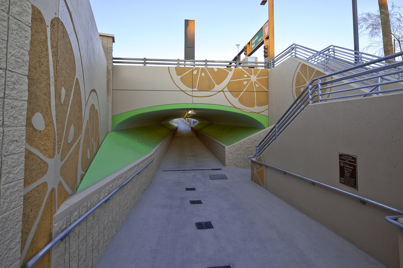 Arizona Department of Transportation’s $2.8 million Litchfield Pedestrian Underpass project offers a safe crossing for pedestrians and bicycles at the busy intersection with heavy foot traffic. The underpass also includes public art, improved electrical and landscaping, and sidewalk and ramp improvements. Pedestrians, cyclists, and golf carts can utilize the underpass as a safe link between downtown Litchfield Park and the nearby Wigwam Golf Resort, improving connections between local businesses and the resort.