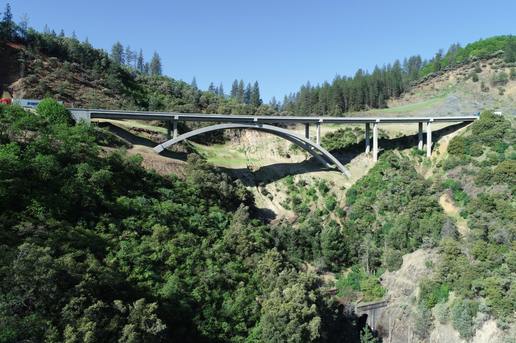 With limited access, steep terrain, and a lack of foundation under its right-of-way, the 75-year-old side hill bridge on Southbound Interstate 5, north of Redding, was in need of replacement. Given its shape and the rocky terrain, the California Department of Transportation (Caltrans) came up with an innovative solution to address the problem. That solution was the $34.5 Shasta Viaduct. This new bridge spans over 800 feet, with a design that incorporates asymmetrical arches to account for the horizontal curve in the structure and the varying levels of elevation. Working through two of the largest devastating wildfires in the state’s history, the construction and design teams had their share of challenges. The result is a bridge that will withstand an earthquake, but also save taxpayers money by reducing maintenance costs. With its new service life is projected to last beyond 100 years, the greatest benefit of all is the increased safety to travelers.