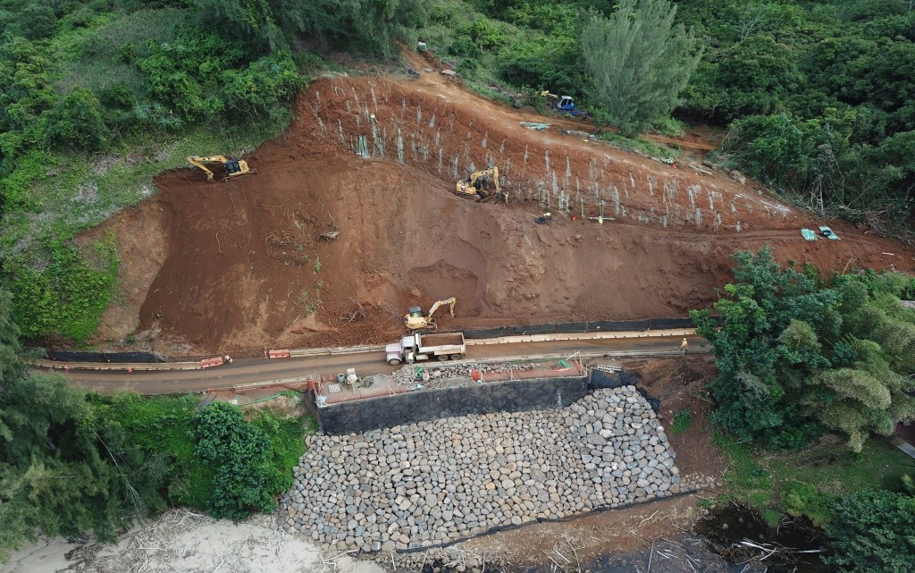 The communities of Waipa, Waikoko, Wainiha and Haena along Kauai’s north shore were hit with a national record of 49.69 inches of rainfall on the night of April 14, 2018. This massive rainfall (known as ua loku in Hawaiian) resulted in 14 landslides along the Kuhio Highway between Waikoko and Wainiha, effectively shutting down the only land-based route between these communities and the rest of Kauai. The Hawaii Department of Transportation (HDOT) had to come up with a solution to reopen the road to traffic quickly. HDOT got to work addressing the challenge on multiple fronts. Crews and material from all islands were flown in by helicopter and shipped in by barge to clear mud and debris from the Wainiha and Haena ends of Kuhio Highway until a one-lane emergency road could be punched through the landslides.