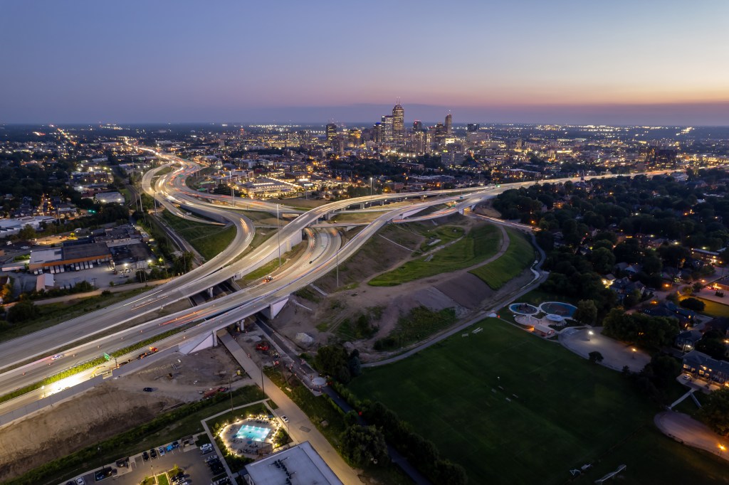The I-65/I-70 North Split in Indianapolis – originally built in the 1960s and 1970s – is central Indiana’s busiest interchange, serving 220,000 motorists daily. However, over that half century of use, the highway pavement and nearly 50 bridges along that corridor deteriorated – with crash rates exceeding statewide urban interstate averages. To address those issues, the Indiana Department of Transportation undertook a $350 million reconstruction project to improve roadway capacity, eliminate weaving, and reduce merging – thereby enhancing traffic flow, access, and safety. The project also boosted downtown walkability with upgraded sidewalks and lighting at all crossings. The redesigned North Split now offers better traffic flow and safety while improving quality of life in surrounding neighborhoods. The project reduced highway noise with sound-absorptive barriers and specialized pavement treatments. Residents benefit from wider sidewalks, enhanced lighting, and the new Monon Loop urban trail. The interchange’s smaller footprint also created new greenspace – featuring natural grasses as well as 100,000 new shrubs, trees, and other plants – as well as utility upgrades as well as sewage and storm water drainage improvements.