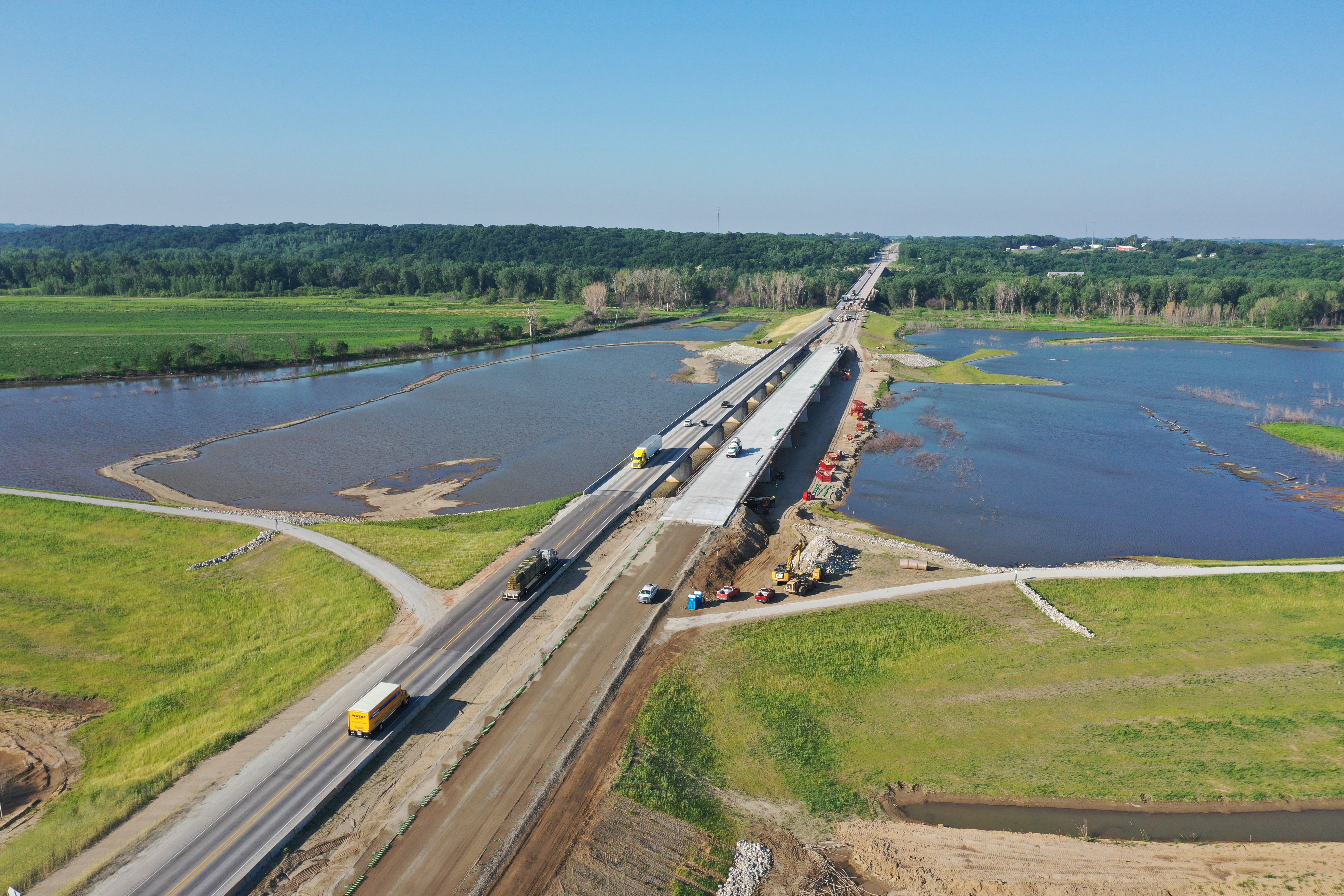 When a bomb cyclone struck Iowa in 2019, it deluged the state with significant amounts of rain and snow – with Iowa’s Highway 2, a main connector to Nebraska, severely affected by flooding. The increase in flooding caused traffic backups for needed goods, services, and the community – turning a 10-minute commute into an hour and a half wait due to that flooding. The Iowa Department of Transportation worked to complete a $35 million bridge levee project that eliminated bottleneck congestion and kept travelers safe on the Highway 2 bridges. The project reduced the risk of floods by constructing a new levee bridge that opened two months ahead of schedule. Coordinating with its partners, Iowa DOT’s operations efforts were able to save time and complete the bridge ahead of schedule.