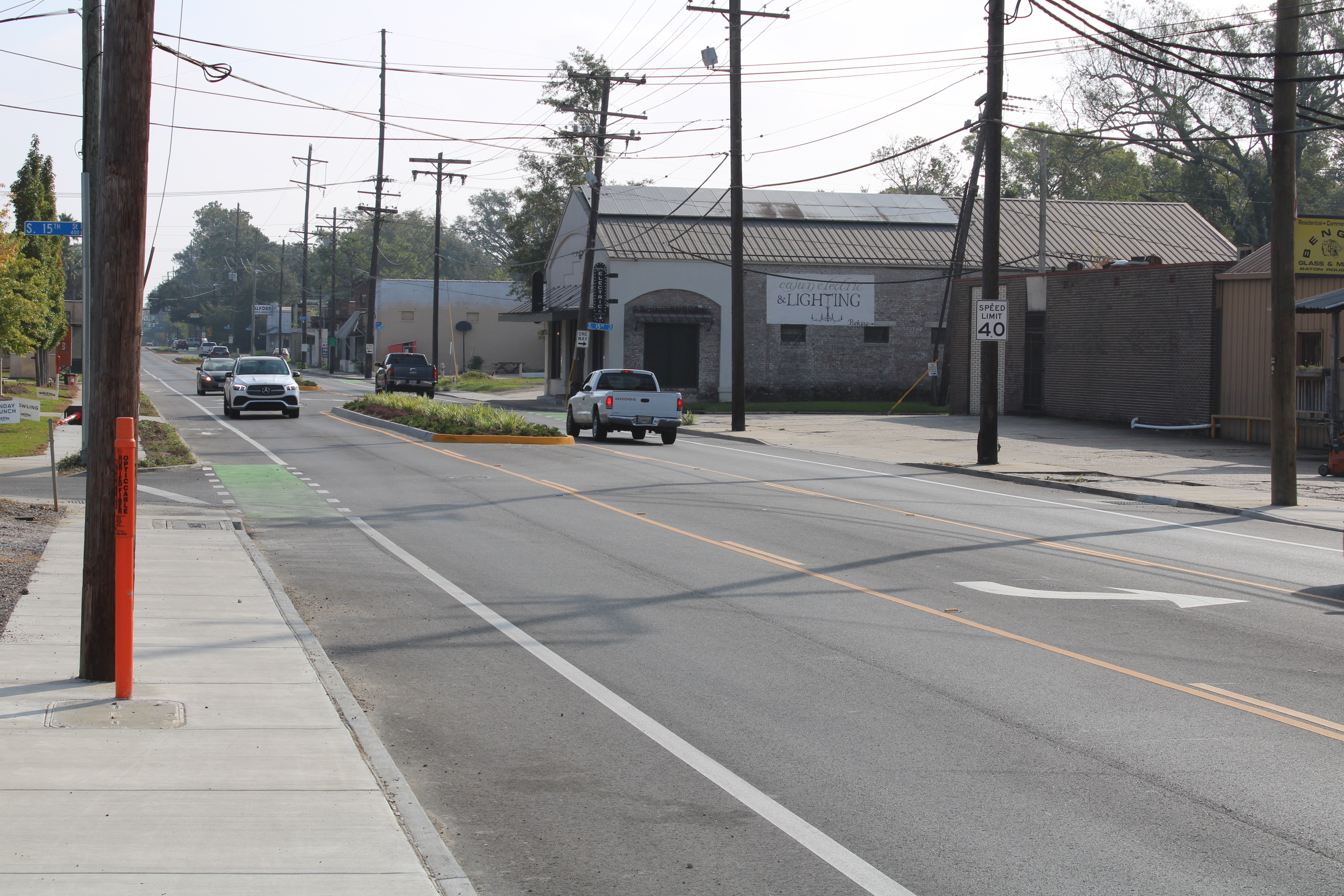 After conducting a safety analyses, Louisiana DOTD found that Government Street in Baton Rouge had segments with crash rates greater than two times the statewide average for similar four-lane section roadways. Approximately 800 crashes occurred from 2008 – 2010. To make all people safer on the roadway while providing better multimodal transportation options, DOTD’s $11.7 million road diet project consisted of reducing Government Street to one travel lane in each direction, with a two-way-left-turn-lane in the center, along with raised divider islands and sidewalk improvements with ADA accessible ramps and bicycle lanes in each direction. Additionally, a roundabout was constructed to replace the signalized intersection. Now, all users of the roadway—whether traveling by car, bike, or on foot—are safer and have greater mobility options on Government Street.