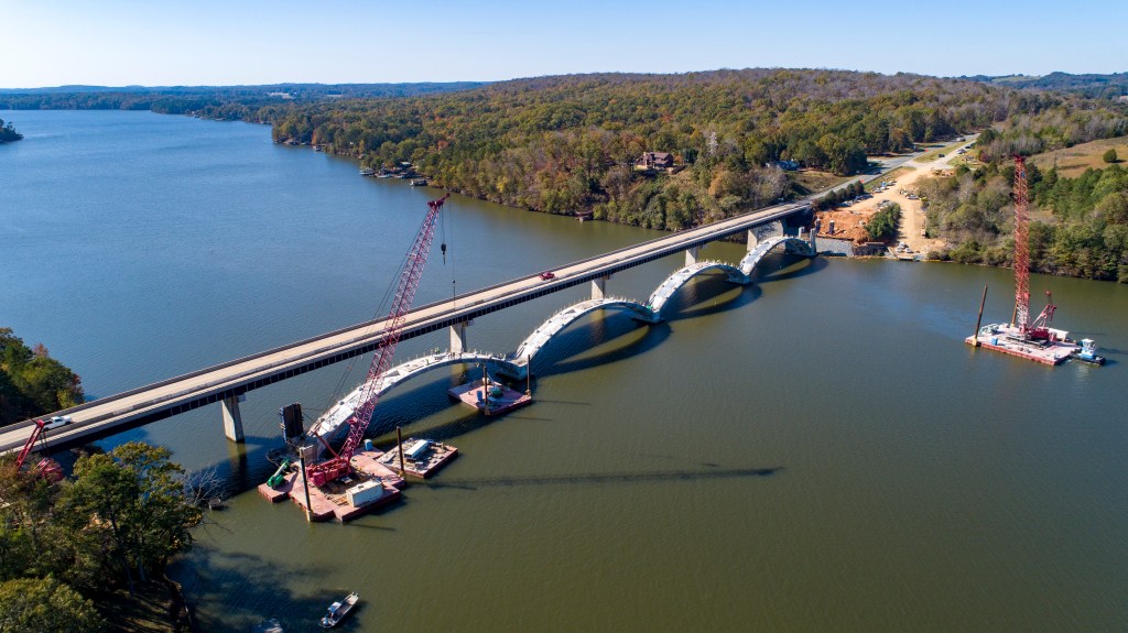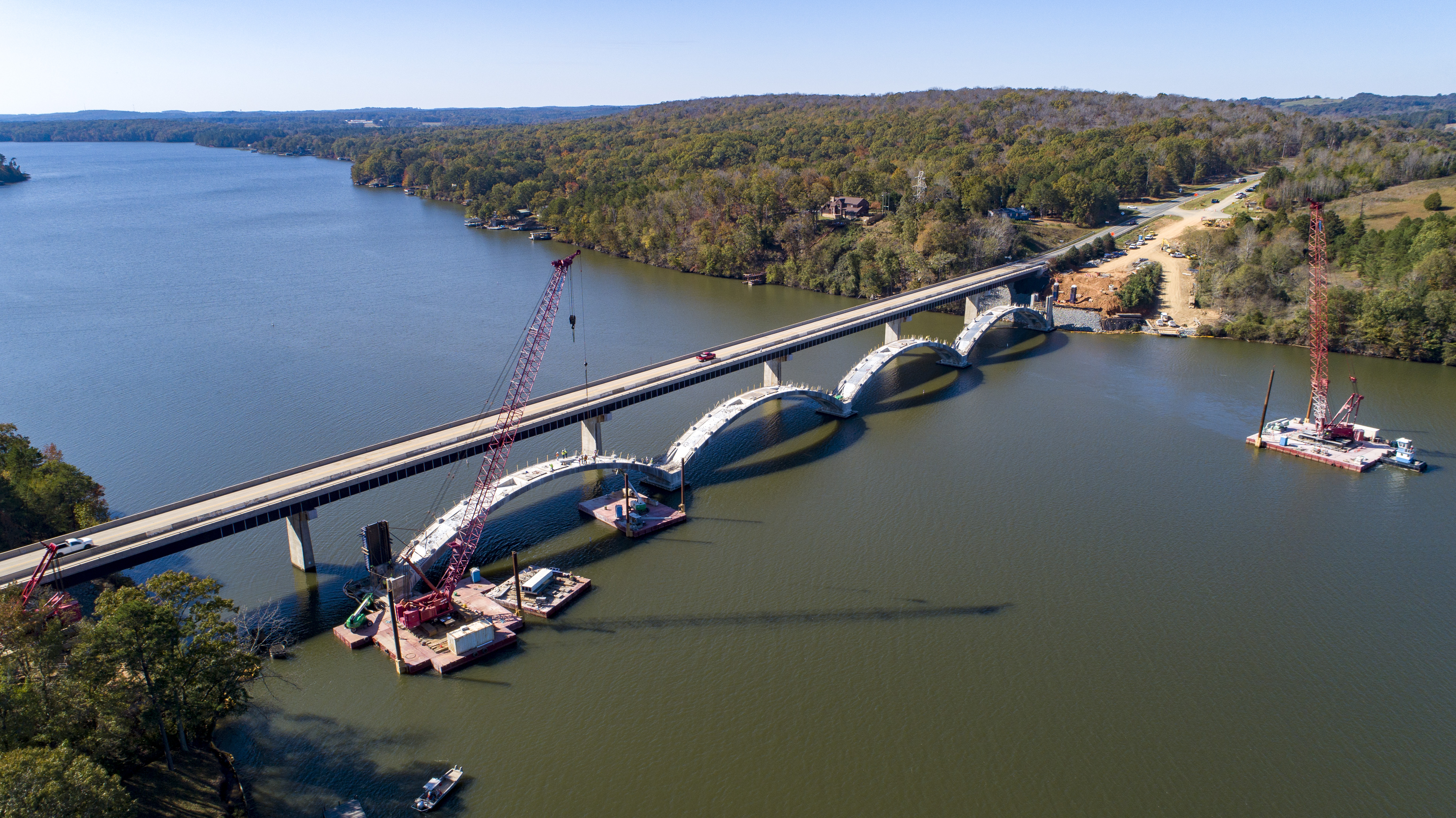 North Carolina DOT addressed congestion issues while simultaneously preserving a little bit of history in the process. The NC 24/27 corridor runs through the scenic Uwharrie National Forest connecting central North Carolina to the growing Charlotte area. Traffic volumes required widening the road to four lanes but a historic concrete spandrel arch over Lake Tillery was too narrow to carry those new lanes. The original plan to replace the bridge did not meet stakeholder needs. After a feasibility study it was determined the bridge could be demolished down to the arches and rebuilt with a two lane superstructure. In addition, the parallel bridge built in 1978 required extensive repairs due to concrete damage. The end result is additional capacity over Lake Tillery to accommodate growth in the area, easing congestion for motorists while preserving one of the last surviving examples of concrete and open spandrel arch bridges in the state.