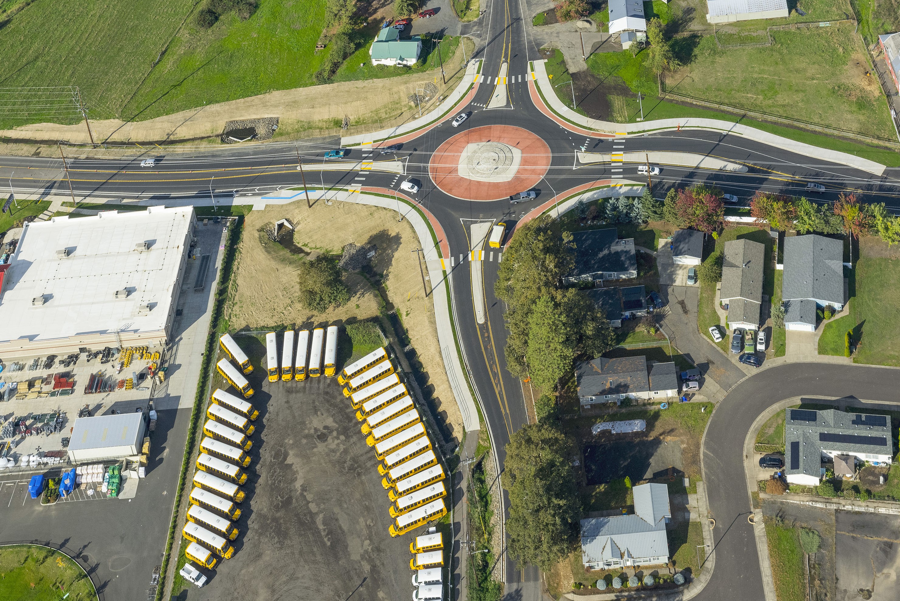 Oregon Department of Transportation, in partnership with the City of Molalla, needed to improve safety at an intersection on Toliver Road that suffered 38 crashes between 2007 and the end of 2016, with 83% of them injury crashes. Designed for agricultural trucks, tractors, fire engines, and school buses, the $7.8 million roundabout at Toliver Road has improved travel safety and slowed rural high-speed traffic entering town. The intersection serves highway traffic – including freight and agricultural vehicles – as well as growing residential traffic and a school bus depot. Before construction began, Toliver Road was regulated by a stop sign; causing travelers, including school buses, to endure significant delays when accessing Oregon Route 213. Now, the new roundabout improves both safety and efficient access to OR 213, with Toliver Road traffic no longer experiencing long waits or life-threatening close calls. The roundabout project also added sidewalks, crosswalks, and lighting to improve safety and comfort for bikes and pedestrians. Local businesses, residents, and commercial trucks now navigate the intersection more safely and efficiently, reducing wait times on Toliver Road. This boosts travel time reliability and enhances fuel efficiency by minimizing idle time. Moreover, roundabouts can cut fatalities by up to 90% and crashes by 35%.