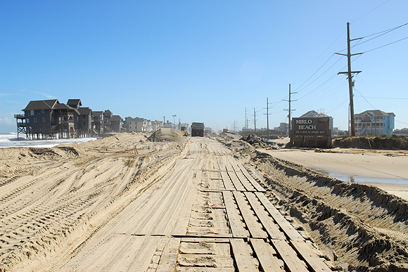 North Carolina Department of Transportation quickly rebuilt two critical portions of N.C. 12, which trails along the Outer Banks, after Hurricane Irene destroyed nearly 4,300 feet of pavement. The damage done to N.C. 12 also eliminated the only highway connection to the mainland from the Outer Banks, causing many to be stranded. Most of the damage was done within the Pea Island National Wildlife Refuge and also just north of Rodanthe. NDCOT quickly developed and executed a $12 million plan to repair the transportation network, restore the pristine environment, and revive the lifeline to the community. Working swiftly to gather permits and survey the area, NCDOT used sand sources to fill damaged road and repair the protective dune system. All of the work occurred while NCDOT ferries provided access for residents, construction crews, and emergency suppliers. After cooperation with local, state, and federal partners, N.C. 12 opened to traffic 44 days after the hurricane. |