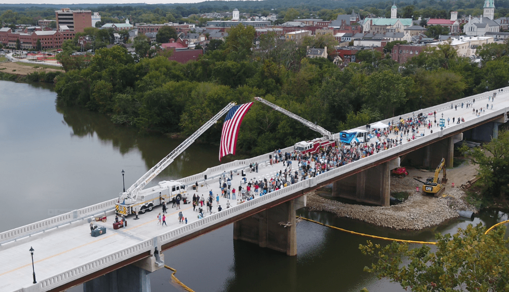 Built in 1941, Chatham Bridge in downtown Fredericksburg posted with a 15-ton weight limit for single-unit vehicles, with a bridge superstructure and substructure classified as “poor” on the National Bridge Inspection Standards scale. Steady, severe deterioration in the bridge deck was accelerated further by record-setting rainfall in 2018. Narrow, 4-foot-wide sidewalks were not suitable for pedestrians. To fix all this, Virginia DOT significantly transformed the Chatham Bridge by adding a 10-foot-wide shared use path for bikes and pedestrians that connects to a local trail, a more expansive bridge deck, new LED lighting, and a scenic overlook of the Rappahannock River. Because of this $23 million rehabilitation project, that vehicle weight limit was lifted, allowing vehicles with legal loads and heavier emergency response equipment to cross the bridge, improving efficiency and emergency response.