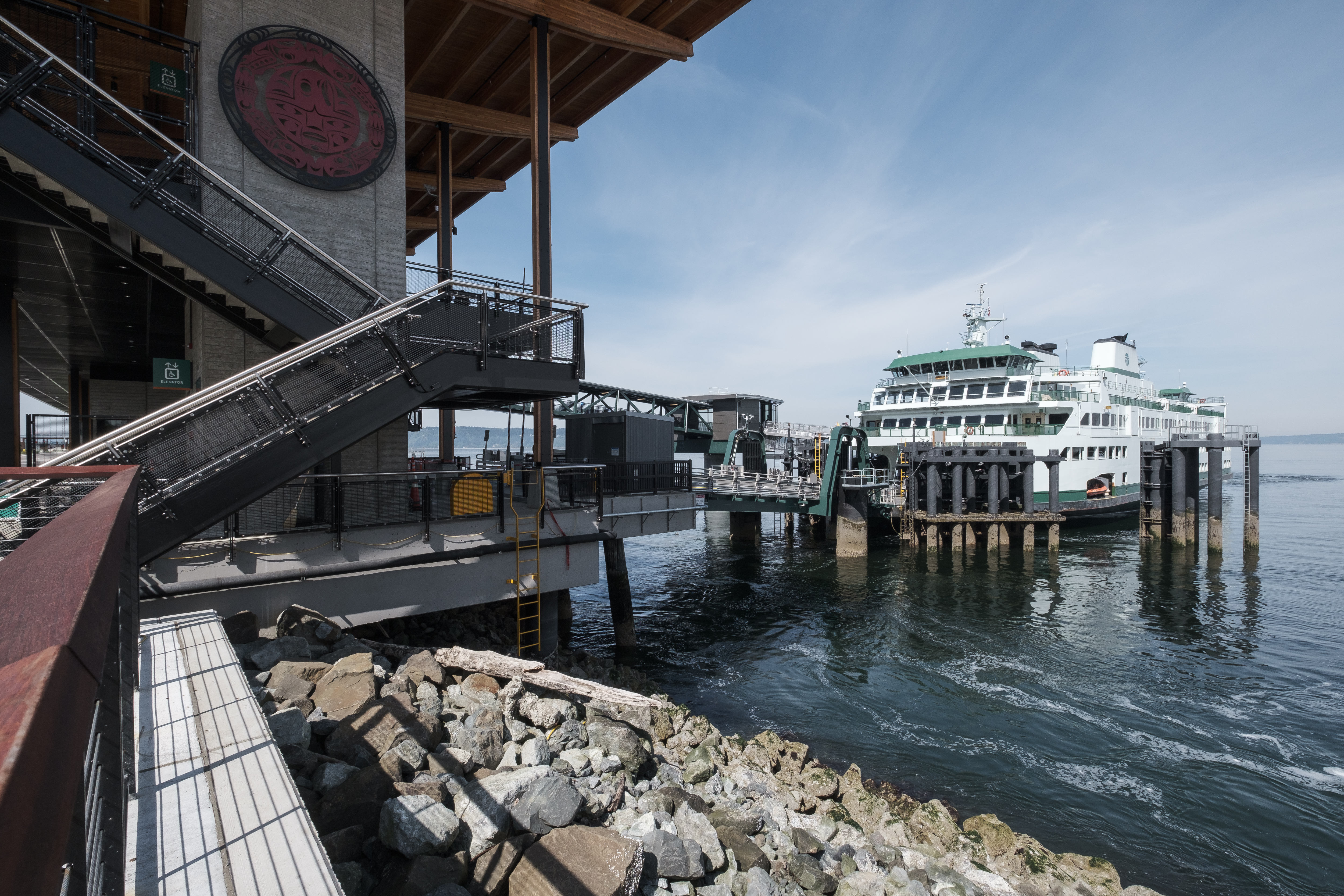 The new $187 million ferry terminal increases efficiency by loading pedestrians and vehicles simultaneously and improves access to transit by locating the ferry terminal closer to the Sounder commuter rail station and providing a bus transit center. The project also replaced a 63-year-old, seismically deficient terminal built on eroded timber piles with a safer, more efficient facility. Washington State DOT also worked with local tribes to feature “cultural motifs” and interpretive boards conveying tribal history within the terminal’s design.